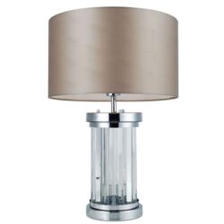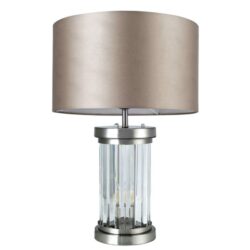 This table lamp features a satin chrome finish with a clear glass stand. Complete with a simplistic silk shade. Classic in its style, this table lamp is a timeless way to update your space.