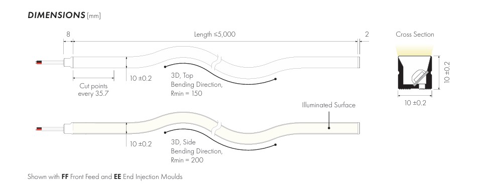 LED NEON Flex 3D Bend offers unmatched creative freedom, with the ability for horizontal and vertical bending (side to side and up and down, across and along the light-emitting surface). It is ideal for crafting fully three-dimensional shapes and curves. Perfect for complex installations, bespoke features, and immersive environments, it empowers designers to push boundaries. Enjoy smooth, shadow-free illumination and a flawless finish from every angle.